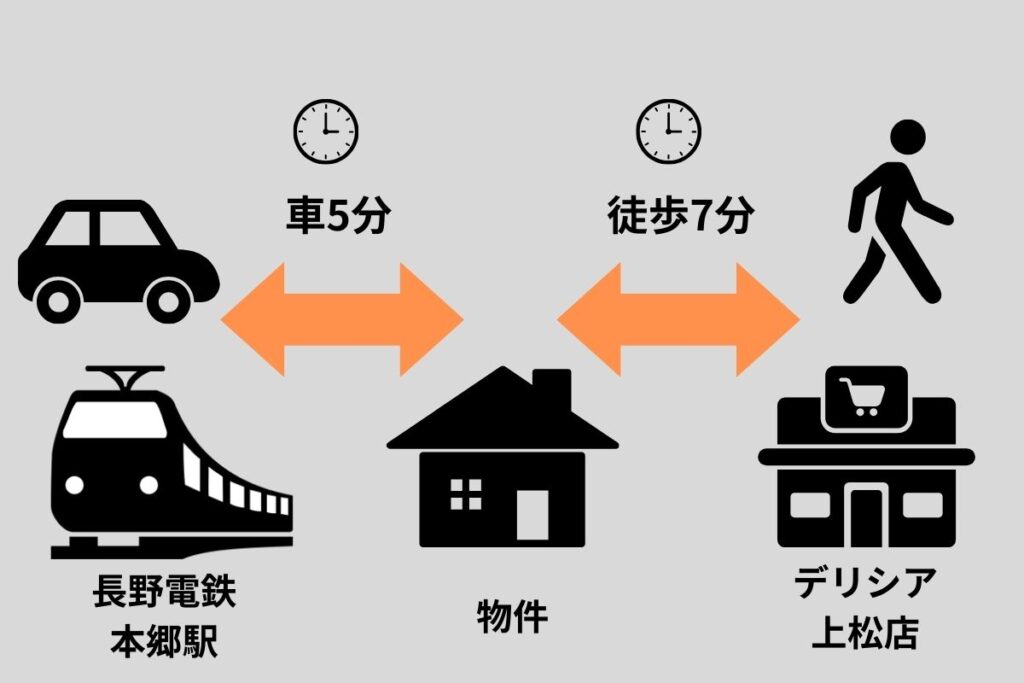 今回は徒歩でデリシア上松店様まで7分、長野電鉄本郷駅まで車で5分。