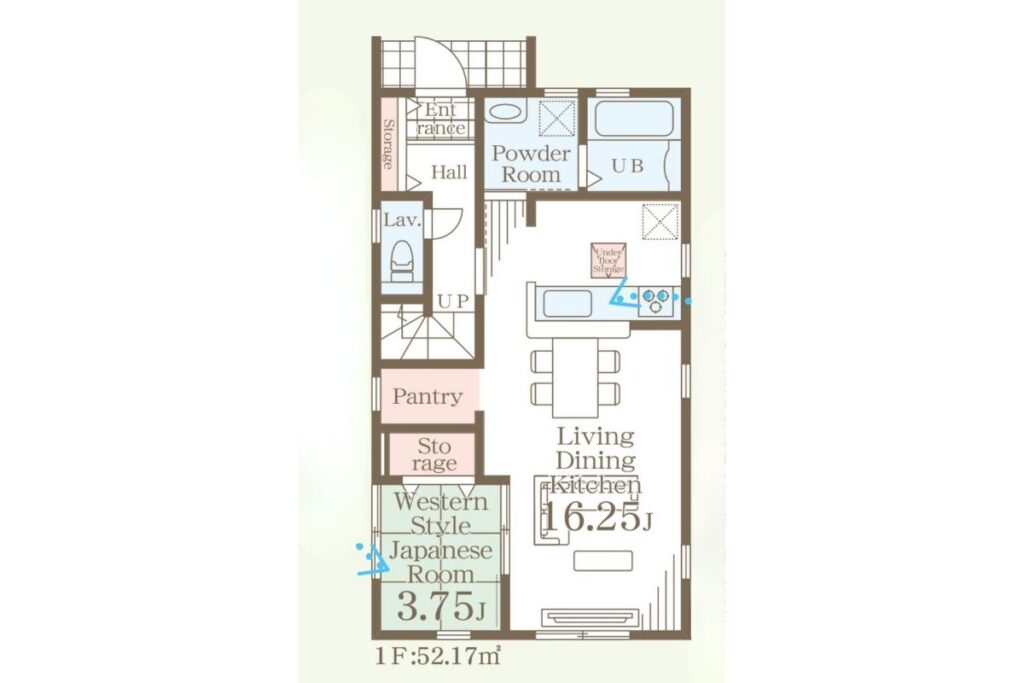 1Fはリビング16.25帖、和室3.75帖。パントリーもついています。