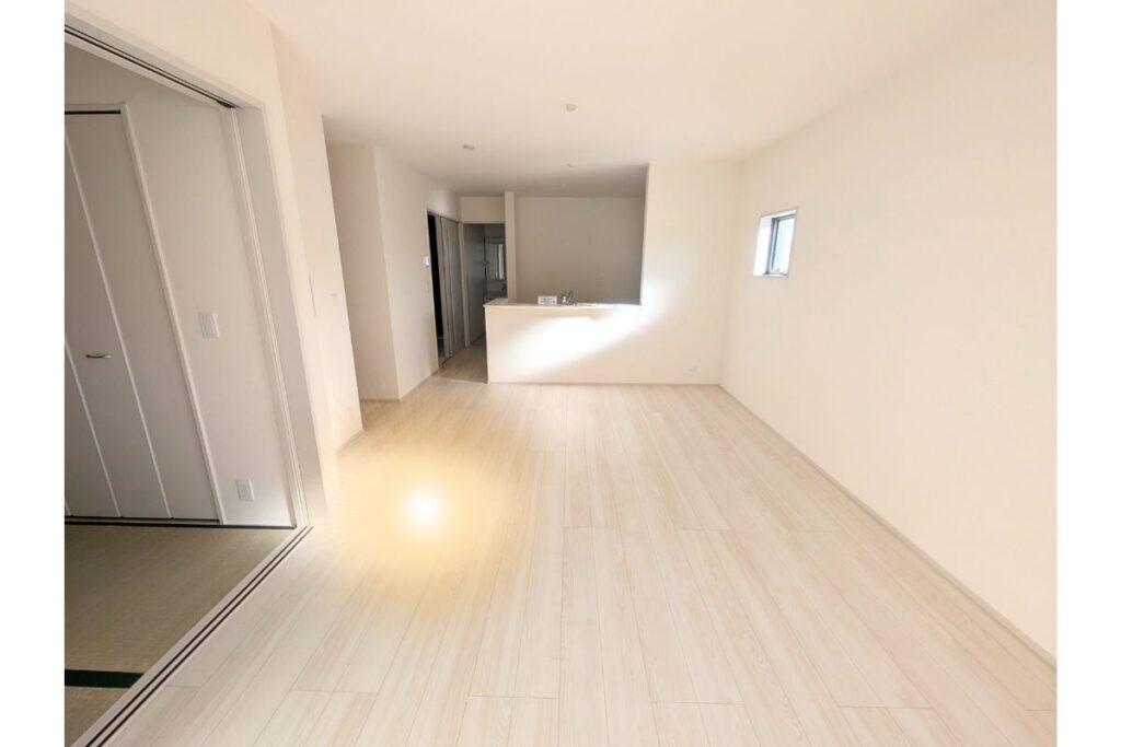 1Fの16.25帖のリビング。こちらにインターフォンや浴室操作パネルもついています。左手にコンパクトな和室。