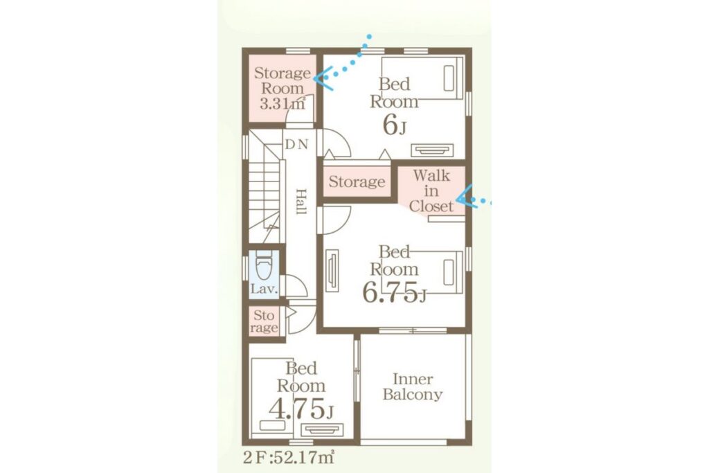 2Fは6.75帖、6帖、4.75帖にルーフバルコニーとウォークイン、納戸3.3㎡付です。
