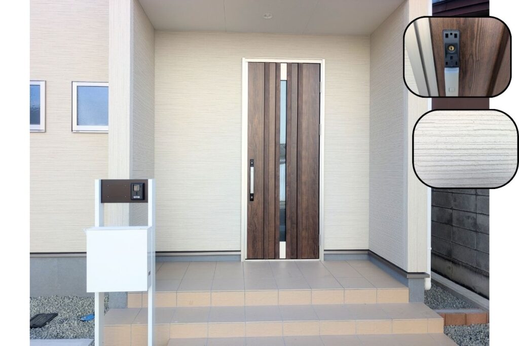 玄関はウッド調です。スマートロック、サイディングはこの感じです。