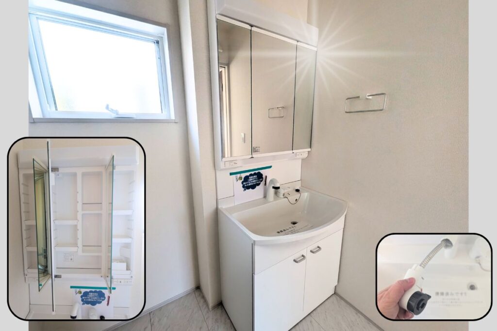 洗面台はシャワーノズル付きで、鏡の裏側にも収納もついております。