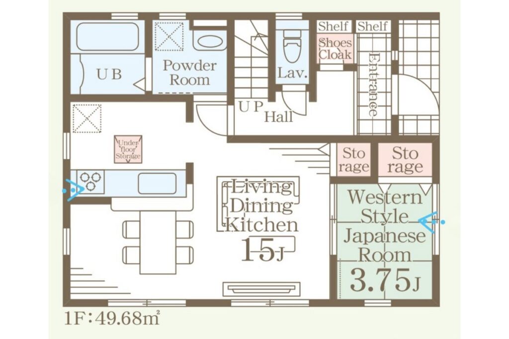 1F リビングは15帖、和室3.75帖