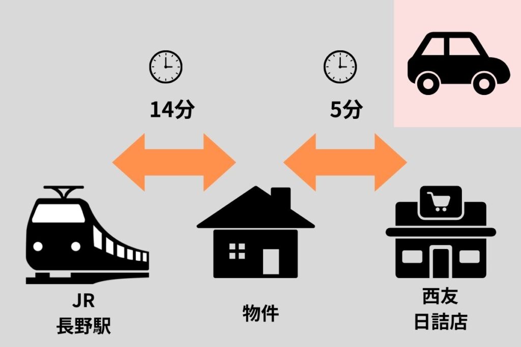 およそお車でJR長野駅まで14分。西友日詰店まで5分です。