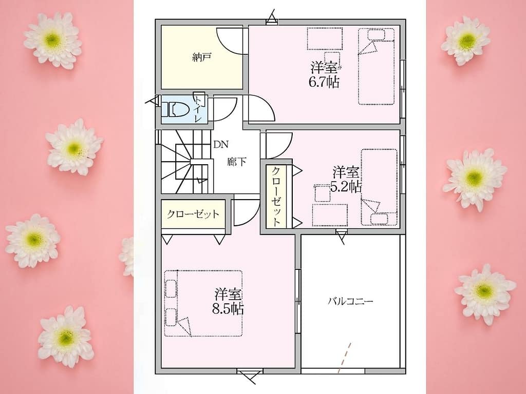 2Fは 6.2帖 5.2帖 8.5帖+納戸、ルーフバルコニー。