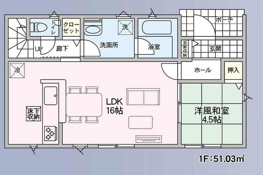 1Fはリビング16帖。和室4.5帖。床下収納。