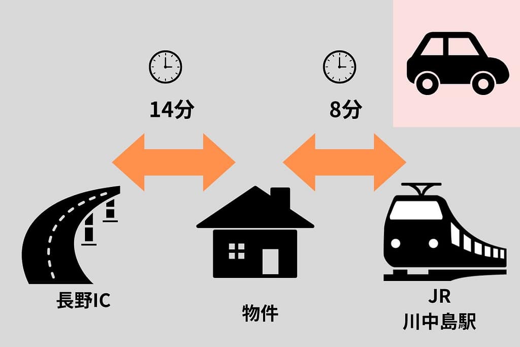 お車でおよそ長野ICまで14分、JR川中島駅まで8分。